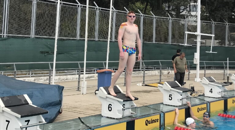 Miha Potočnik spremlja plavalca Nika Peterlina na dogodku Multinations Cupu Limassol na Cipru.